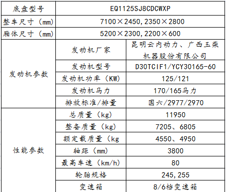 3800MM軸距,多利卡D7寬體駕駛室,玉柴165馬力發(fā)動機(jī),6檔變速箱,245/70R19.5輪胎,2.97L排量,中控鎖,電動門窗,方向助力,原廠空調(diào),防碰撞,防軌道偏移。