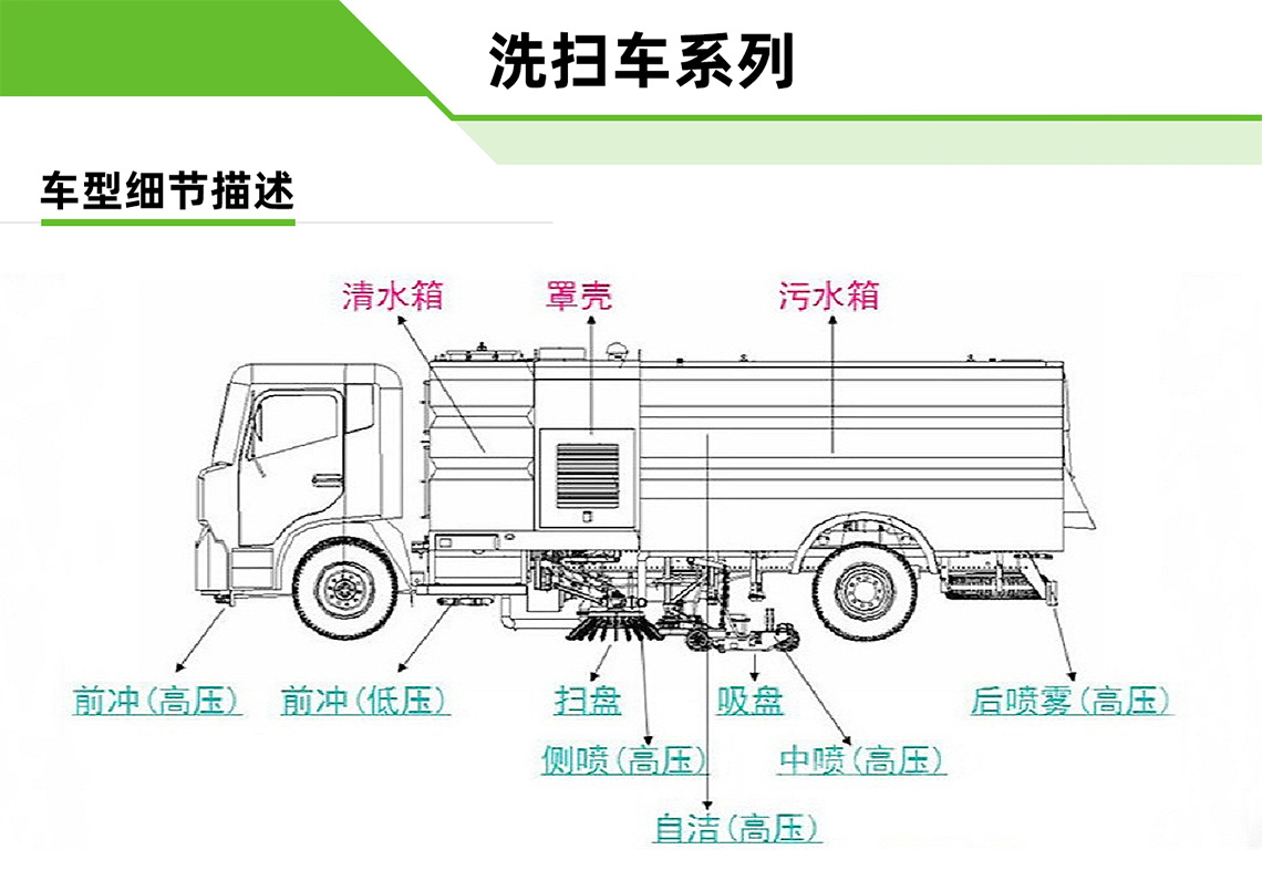 洗掃車集掃路車、灑水車和高壓清洗車功能于一體,具備路面清掃、路面洗刷、高壓清洗、低壓沖洗、路緣石洗刷、垃圾收集、污水回收、噴霧降塵和道路隔離墻清洗、小廣告清洗等多種作業(yè)功能。