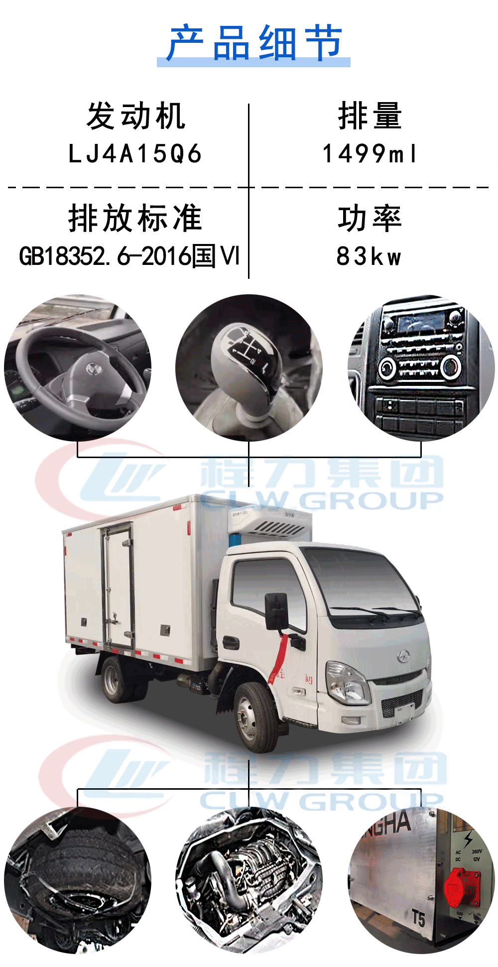 | 其他 | 1.ABS控制器型號/生產(chǎn)廠家:YF8/武漢元豐汽車電控系統(tǒng)有限公司;2.LJ4A15Q6凈功率為79kw,對應油耗值為9.6L/100km;3.車廂頂部封閉不可開啟;4.車廂可選裝不開門或側(cè)開門,可選裝左或右側(cè)開門,不同外觀側(cè)門和后門;5.可選裝導流罩;6.選裝其他廠家功率相當?shù)闹评錂C組,KV300英格索蘭(中國)投資有限公司,K125勁達技術(河源)有限公司,MK358勁達技術(河源)有限公司;7.冷藏車類別:F類;8.隨底盤選裝駕駛室前圍面板,前圍格柵,后視鏡,前部燈具,前保險杠外觀,擴展輪輞外觀,擴展輪眉,隨底盤選裝排半駕駛室;9.駕駛室左側(cè)車門選裝裝飾標貼. | ||